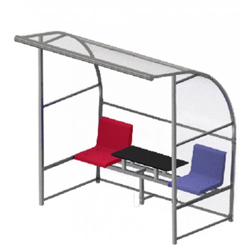Скамейка состоит из металлического каркаса и поликарбонатных защитных вставок, имеет писчий столик 450х850мм, подходит для размещения 2 игроков.